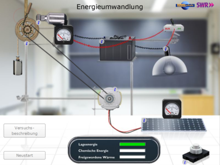 In dieser Simulation kann man beobachten, wie verschiedene Energieformen ineinander umgewandelt werden können und wo Energieverluste auftreten. Sogar der Traum eines jeden Ingenieurs, ein "Perpetuum-mobile" kann in Gang gesetzt werden.