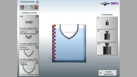 Leinen los und Schiff ahoi! Ein simples Floß aus Holz, ein kleines Schiffchen aus drei Kunststoffzylindern oder ein Boot aus zwölf Stahlbrettern – welche Konstruktion ermöglicht die höchste Tragfähigkeit? In der virtuellen Werft hat man die Möglichkeit, verschiedene Schiffsformen und -materialien miteinander zu kombinieren und sie bei einem Seegang auf ihre Belastbarkeit zu überprüfen.