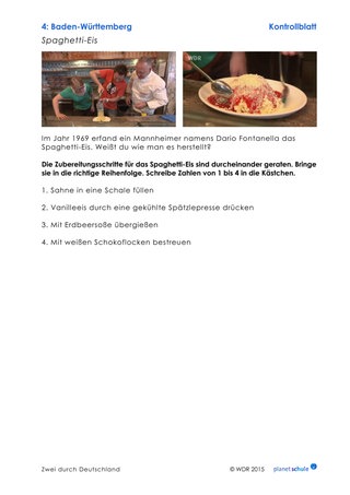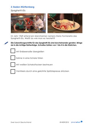 Nachdem die Schüler im Film (Timecode: 11:45 - 16:13 Min.) gesehen haben, wie man Spaghetti-Eis herstellt, können sie dieses Thema nun vertiefen. Dazu müssen sie die einzelnen Zubereitungsschritte in die richtige Reihenfolge bringen. Die Aufgabe kann gegebenenfalls als Partnerarbeit gelöst werden. Lernschwächere Schüler profitieren so von stärkeren.