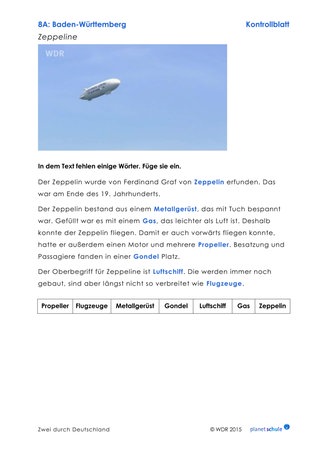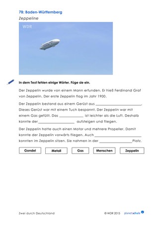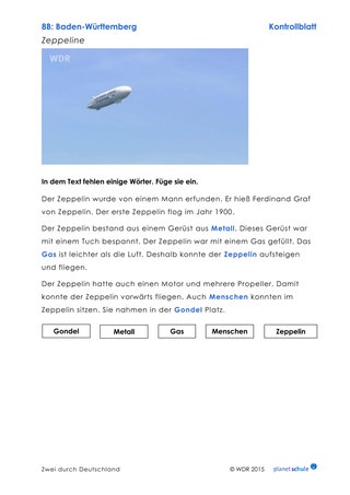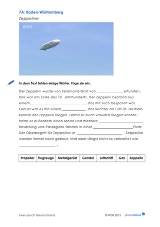 Als Vertiefung zum Thema Zeppeline füllen die Schüler in Einzelarbeit einen entsprechenden Lückentext aus. Der Lückentext liegt in zwei Schwierigkeitsstufen vor, sodass eine Differenzierung möglich ist.
