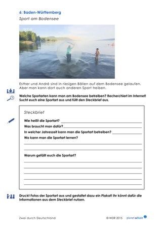Die Schülerinnen und Schüler greifen das Thema Sport am Bodensee auf, das im Film angesprochen wird (Timecode: 22:10 - 28:45 Min.). Dazu sammeln sie zunächst Fotos und Texte. Dann erstellen sie einen entsprechenden Steckbrief beziehungsweise ein Plakat. Lernschwächere Kinder können mit lernstärkeren in Gruppen arbeiten. Ihnen können dann gezielt einfachere Aufgaben zugeteilt werden, zum Beispiel Fotos ausschneiden und aufkleben.