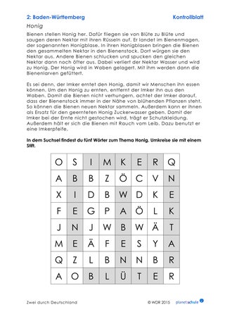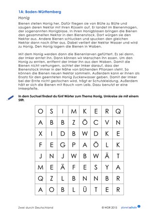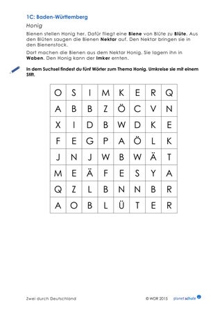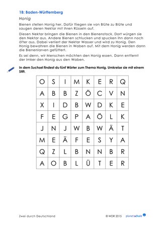 Im Film (Timecode: 00:00 - 06:43 Min.) wird das Thema Honig angesprochen. Zur Vertiefung lesen die Schüler einen Infotext und lösen dazu ein Suchsel. Die Aufgabe ist als Einzelarbeit konzipiert. Der Infotext liegt in drei verschiedenen Längen vor; in der kürzesten Version sind die gesuchten Wörter zudem gefettet. So ist eine Differenzierung zwischen lernstarken und -schwachen Schülern möglich.