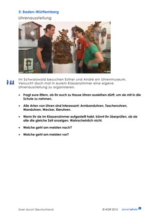 Als weiterführende Beschäftigung mit dem Thema Uhren (Timecode: 16:13 - 22:10 Min.) lässt sich im Rahmen einer Klassenaktion eine Uhrenausstellung organisieren. Dazu bringen die Schüler verschiedene Modelle von zu Hause mit. Dann können sie überprüfen, ob die einzelnen Uhren alle die gleiche Uhrzeit anzeigen.