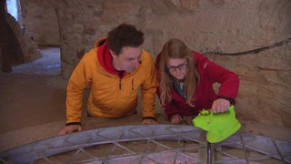 Esther und André kommen ganz schön ins Staunen: Ein Meer in Hessen sollen sie finden! Außerdem einen schreienden Riesen! Und eine grüne Soße! Gibt es das alles denn überhaupt?! Rätselhaft ist sie, die Schnitzeljagd quer durch das Bundesland Hessen. Geradezu märchenhaft wird es dann in Marburg. Die beiden erkunden den „Grimm-dich-Pfad“ und müssen herausfinden, wie lange ein Tropfen zum blauen Licht braucht. Wenn sie doch nur schon mal wüssten, wo sie das blaue Licht finden können.