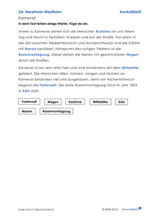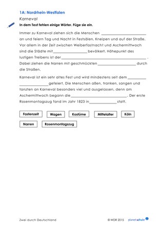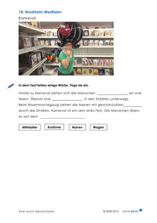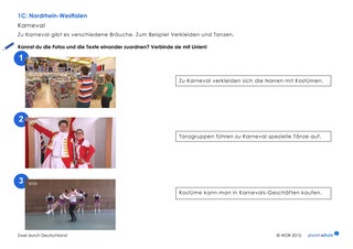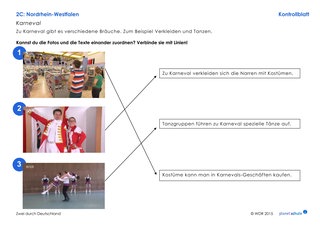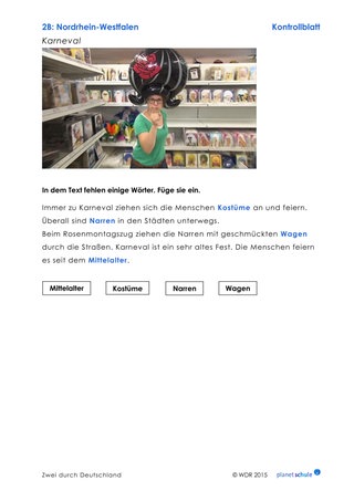 Die Schüler füllen in Einzelarbeit Lückentexte zum Thema Karneval aus beziehungsweise ordnen Bilder und Texte zum Thema Karneval einander zu, um so die Informationen aus dem Film (Timecode: 00:00 - 06:32 Min.) zu vertiefen. Dieses Arbeitsblatt liegt in drei Varianten vor, die sich bezüglich des Schwierigkeitsgrades unterscheiden. So ist eine Differenzierung zwischen lernstarken und -schwachen Schülern möglich.