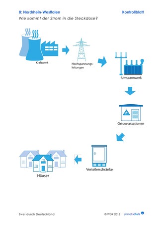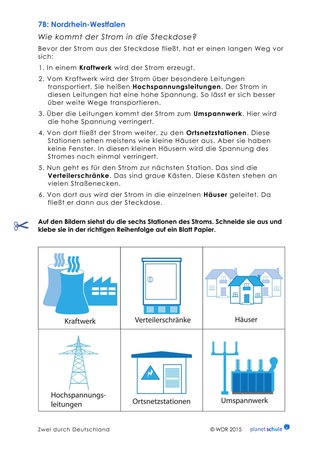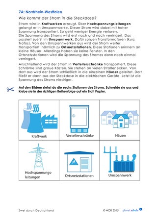 Als weiterführende Beschäftigung lesen die Schüler einen Infotext darüber, wie der Strom vom Kraftwerk in die Steckdose gelangt. Anschließend müssen sie Bilder von den einzelnen Stationen ausschneiden und in die richtige Reihenfolge bringen.