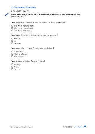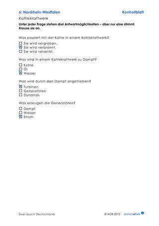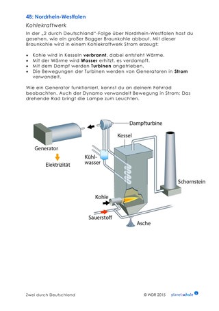 Ein Thema im Film ist der Abbau von Braunkohle (Timecode: 06:32 - 12:13 Min.). Im Anschluss an diesen Filmausschnitt kann die Stromgewinnung im Kohlekraftwerk und der Weg des Stromes vom Kraftwerk in die Steckdose thematisiert werden. Zunächst lesen die Schüler dafür einen Infotext über die Funktionsweise eines Kohlekraftwerks. Dann beantworten sie nach dem Multiple-Choice-Prinzip Fragen dazu. So können sie das im Film angerissene Thema Braunkohle vertiefen.