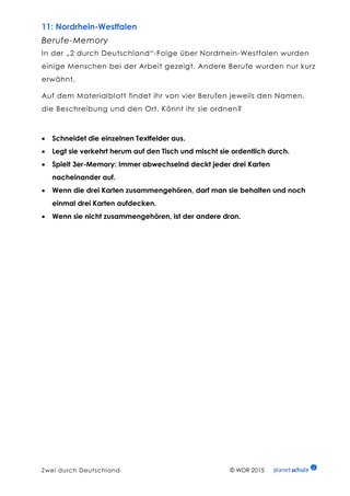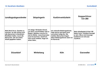 Tourismus und Bergbau, Politik und Karneval: Nordrhein-Westfalen umfasst die unterschiedlichsten Bereiche, auch in wirtschaftlicher Hinsicht. Um die Informationen aus dem Film zu verinnerlichen, spielen die Schüler ein Gedächtnisspiel. Thematisch befasst sich das Spiel mit Berufen, die im Film erwähnt oder gezeigt wurden. Auf jeweils drei Zetteln stehen eine Berufsbezeichnung, eine Berufsbeschreibung und ein Arbeitsort. Entsprechend den üblichen Memory-Regeln müssen die Schüler die Zettel korrekt zuordnen. Da das Spiel als Partnerarbeit konzipiert ist, können lernschwache von lernstarken Schülern unterstützt werden.