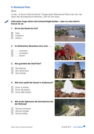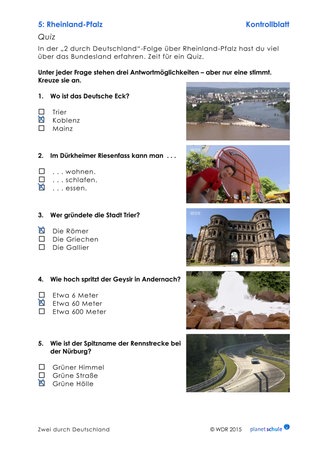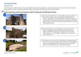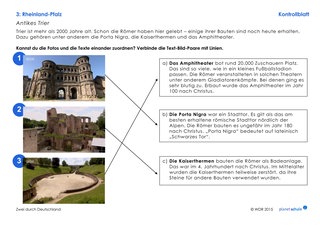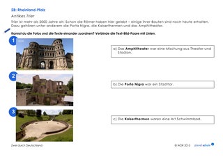 Als Vertiefung zum Thema antikes Trier (Timecode: 14:29 - 19:13 Min.) können die Schüler in Einzelarbeit jeweils drei Texte und Fotos von römischen Bauwerken einander zuordnen. Für lernschwächere Schülerinnen und Schüler liegt das Arbeitsblatt als Variante vor, in der die Texte gekürzt sind. Anschließend setzen sich die Kinder mit weiteren Sehenswürdigkeiten in Rheinland-Pfalz auseinander. Dafür sollten sie den gesamten Film gesehen haben. Danach beantworten die Schülerinnen und Schüler fünf Fragen zu Sehenswürdigkeiten nach dem Multiple-Choice-Prinzip.