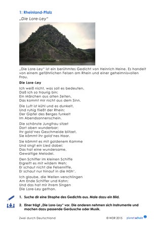 Im Film (Timecode: 0:00 - 9:00 Min.) wird der Loreley-Felsen und die passende Sage thematisiert. Dieses Thema kann an dem Gedicht von Heinrich Heine vertiefend aufgegriffen werden. Zunächst lesen die Schülerinnen und Schüler das Gedicht "Die Lore-Ley" von Heinrich Heine.