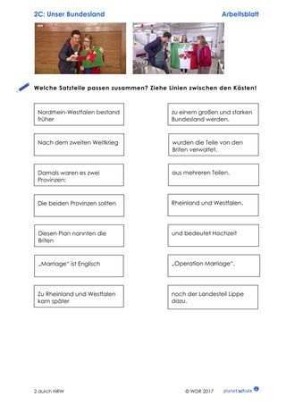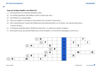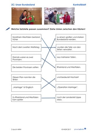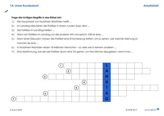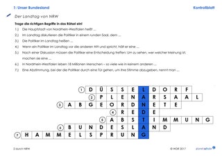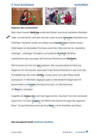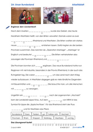 Im zweiten Teil des Films (Timecode 5:55 Min. bis Ende) geht es zunächst um die Gründung von NRW (Timecode 5:55 – 9:36 Min.), das NRW-Wappen und Lippe als dritten Landesteil. Dazu gibt es einen Lückentext mit ergänzenden Infos. Wenn die Lücken richtig gefüllt sind, entsteht aus Buchstaben der Lücken-Wörter das Lösungswort "Nordrhein-Westfalen".