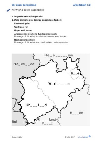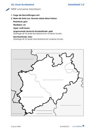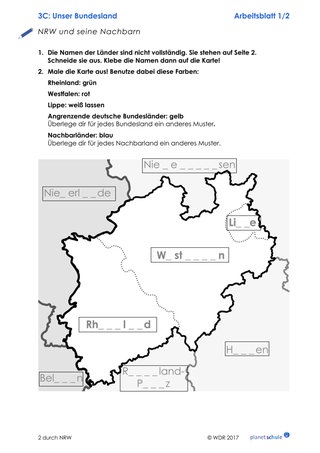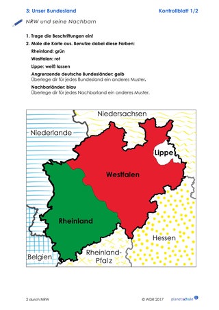 Abschließend befassen sich die Kinder mit Wappen und Karte von NRW. Die Kinder erhalten eine Karte von NRW, den drei Landesteilen und den angrenzenden Ländern bzw. Bundesländern, die sie vervollständigen sollen. Die Lehrkraft hängt Kontrollblätter zu den Karten an der Wand auf. Die Kinder können sie – wie beim Schleichdiktat – so oft anschauen wie sie wollen, um die Aufgabe zu lösen. Anschließend malen sie das Wappen von NRW in den richtigen Farben aus.