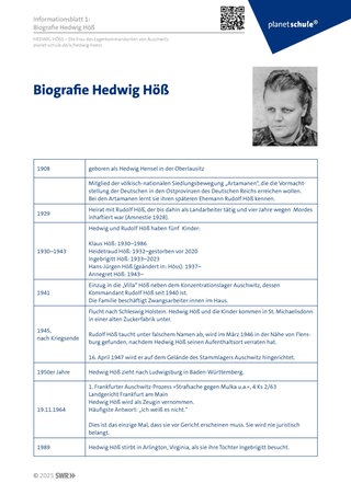Material: Film „Hedwig Höß – die Frau des Lagerkommandanten von Auschwitz“, Internet, 3 Arbeitsblätter, Tafel