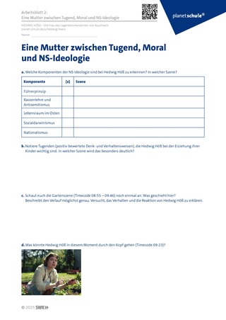 Die Schüler:innen schauen den Film „Hedwig Höß – die Frau des Lagerkommandanten von Auschwitz“ mit dem Beobachtungsauftrag „Tugend, Moral und NS-Ideologie“. Dabei stellen sie zunächst die Verstrickung von Hedwig Höß in der NS-Ideologie fest und reflektieren danach die Tugenden, die Hedwig Höß bei der Erziehung ihrer Kinder wichtig sind (Arbeitsblatt 2 – Eine Mutter zwischen Tugend, Moral und NS-Ideologie).