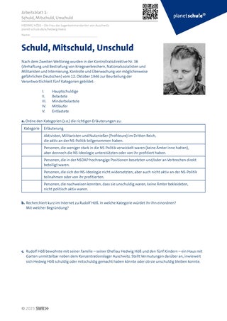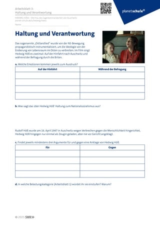 Daraufhin können die Schüler:innen herausarbeiten, dass bei Hedwig Höß keine explizite Haltungsänderung eingetreten ist, sondern dass sie trotzig an der NS-Ideologie festhält. Dadurch werden die Schüler:innen motiviert, sich mit der komplexen Frage nach ihrer individuellen Schuld, Mitschuld, Verantwortung auseinanderzusetzen und sowohl Fürsprache zu halten als auch Anklage zu erheben und entsprechende Argumente abzuwägen (Arbeitsblatt 3 – Haltung und Verantwortung).