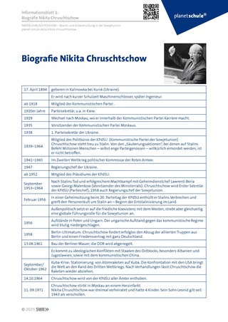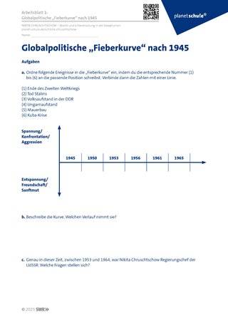 Vorgestellt werden zunächst wichtige Ereignisse von 1945 bis 1965 in Kurzfassung: Das Ende des Zweiten Weltkriegs 1945, Stalins Tod 1953, Volksaufstand DDR 1953, Ungarn-Aufstand 1956, Berliner Mauer 1961 und Kuba-Krise 1962. Diese Ereignisse werden dann von den Schülerinnen und Schülern in eine globalpolitische „Fieberkurve“ eingetragen, an der sich die Verschärfung der globalpolitischen Situation (Ost-West-Konflikt, Konflikte im Ostblock) ablesen lässt. Die Schülerinnen und Schüler werden darüber informiert, dass Nikita Chruschtschow in dieser Zeit Partei- und Regierungschef der Sowjetunion war. Daraus ergibt sich die Frage nach seinem Einfluss auf die Situation (Arbeitsblatt 1: Globalpolitische „Fieberkurve“ nach 1945).