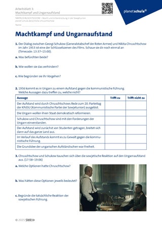 Danach erarbeiten die Schülerinnen und Schüler die politische Haltung Chruschtschows gegenüber sogenannten Abweichlern (Konterrevolution). Sie setzen sich zum einen mit dem Staatsstreich gegen Beria und Malenkow und zum anderen mit der militärischen Reaktion auf den Ungarnaufstand auseinander. Dabei wird die sowjetische Doktrin des Führungsanspruchs im Ostblock begründet und beurteilt (Arbeitsblatt 3: Machtkampf und Ungarnaufstand).Tipps: Das Nachvollziehen der Entscheidung Chruschtschows zum Eingreifen (Aufgabe 3) eignet sich für Kleingruppenarbeit.