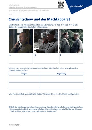 Die Schülerinnen und Schüler befassen sich mit dem Machtapparat von Partei und Staat, indem sie wesentliche Etappen aus dem Lebenslauf Chruschtschows identifizieren, die jeweilige Wirkung auf Chruschtschows Einstellung erläutern und von daher die Komplexität der Verstrickungen aller Akteure in den Apparat aufschlüsseln. Wichtig sind in diesem Kontext die stalinistischen Methoden der Einschüchterung, der Unterdrückung und des Terrors gegen Andersdenkende und Konkurrenten. (Arbeitsblatt 2: Chruschtschow und der Machtapparat). Tipps: Das Beziehungsgeflecht zwischen den Akteuren an der Tafel nachbilden und so die Prinzipien der Ausübung von Macht Unterdrückung sichtbar machen. Die Benennung weiterer prägender Lebenserfahrungen kann im Sinne kognitiver Aktivierung in Kleingruppenarbeit erfolgen.