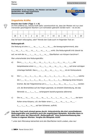 Im Film werden Reibungskräfte bereits angesprochen, mit den Arbeitsblättern 4a, b und c kann das Wissen der Schüler/innen vertieft werden. Bevor sie jedoch den Text zum Thema lesen können müssen sie den Code auf Arbeitsblatt 4a knacken, was in Einzel- oder Partnerarbeit möglich ist.