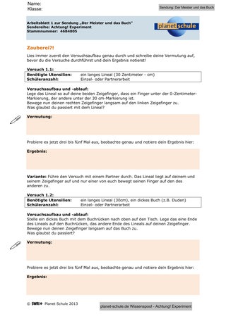 Nach dem Einstieg, in dem die Schüler/innen in Form von Versuchen eigene Erfahrungen zum Thema gesammelt haben, sollen sie erfahren, welch ungeahnte Kräfte in Büchern stecken. Der Film „Achtung! Experiment – Der Meister und das Buch“ wird angekündigt und gezeigt.