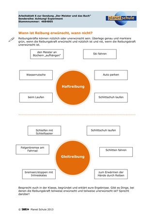 Arbeitsblatt 6 gibt alltägliche Situationen stichpunktartig wieder, in denen wir es mit Reibungskräften zu tun haben. Gemeinsam mit der Lehrkraft sollten die einzelnen Punkte auf dem Arbeitsblatt gedanklich durchgespielt und diskutiert werden. Die Schüler/innen müssen sich zunächst noch einmal klarmachen, was Haft- und Gleitreibung bedeuten und in welchen Situationen welche Kräfte wirken. Dabei sollte auch besprochen werden, was passieren würde, wenn diese Kräfte nicht wirken würden.