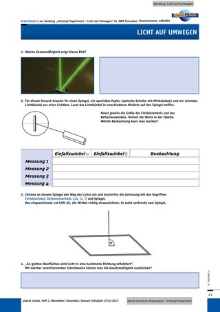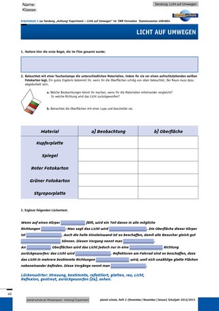 • Die erste Regel, die der Film aus seiner Beobachtung aufstellt, besagt, dass Spiegel Licht reflektieren. In diesem Zusammenhang können zunächst die Begriffe „Reflexion“ und „Streuung“ mit den Schülern erarbeitet werden. Dafür werden mittels Freihandversuchen (Weiteres siehe unten, „Methodische Erläuterungen“) verschiedene Oberflächen bestrahlt und danach beurteilt, ob das Licht in eine bestimmte Richtung reflektiert oder es in viele Richtungen gestreut wird. Daraus wird dann eine Definition für Reflexion und Streuung in einem Lückentext formuliert. (Arbeitsblatt 2)
