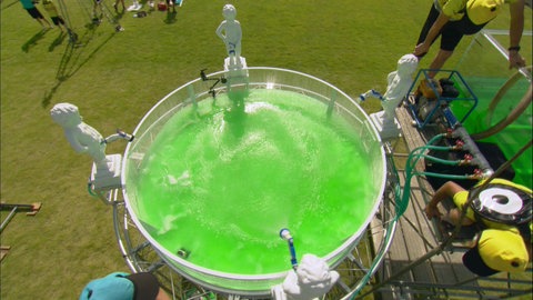 Wir wollen wissen, wieso Windeln große Mengen Flüssigkeit aufnehmen können und trotzdem trocken bleiben. Also schauen wir uns das Innere einer Windel genauer an. Es besteht aus Zellstoff und Superabsorbern, winzig kleinen, aber extrem saugfähigen Kunststoffkügelchen. Wie viel Flüssigkeit können diese Superkügelchen genau aufnehmen? Wir basteln eine riesige Windel auf einem Gestell und lassen vier Probanden an den Start gehen. Sie sollen pinkeln, was die Windel hält…