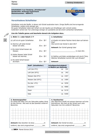 Damit die Schüler/innen sich bewusst werden, dass nicht nur Luft ein Schallleiter ist, sollen sie sich anhand des 4. Arbeitsblattes mit weiteren Schallleitern beschäftigen. Sie erfahren hierbei, welche Stoffe gute und schlechte Schallleiter sind und lernen unter anderem zu berechnen, wie weit ein Gewitter entfernt ist.