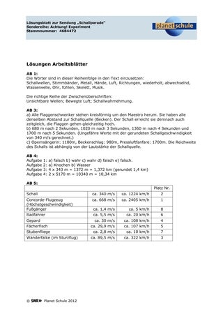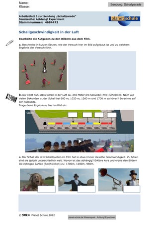 Im Anschluss daran wird der Film gezeigt, zu welchem sich die Schüler/innen Fragen notieren sollen. Diese werden dann nach dem Film im Plenum gemeinsam beantwortet beziehungsweise besprochen. Gefestigt und vertieft kann das durch den Film Gelernte auf dem Arbeitsblatt 3 „Schallgeschwindigkeit in der Luft“ werden. Hier werden die wichtigsten Informationen noch einmal abgefragt und zusammengefasst. Die Schüler/innen können dieses Arbeitsblatt auch in Zweierteams bearbeiten und ihre Ergebnisse in Vierergruppen vergleichen.