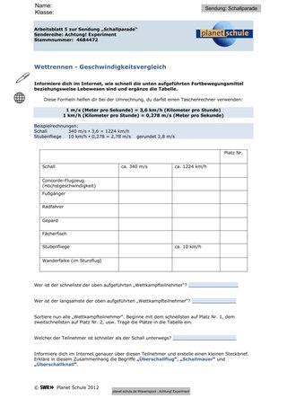 Auch wenn im Film recht anschaulich demonstriert wurde, was 340 Meter/Sekunde bedeuten sind solche Werte für Schüler/innen der Grundschule und Sekundarstufe I oft nur schwer greifbar. Das 5. Arbeitsblatt soll Abhilfe schaffen, indem es zu einem kleinen Wettrennen einlädt. Die Geschwindigkeit des Schalls soll mit der von unterschiedlichen Fahrzeugen und Tieren verglichen werden, um ein Gefühl dafür zu entwickeln, wie schnell der Schall wirklich ist.