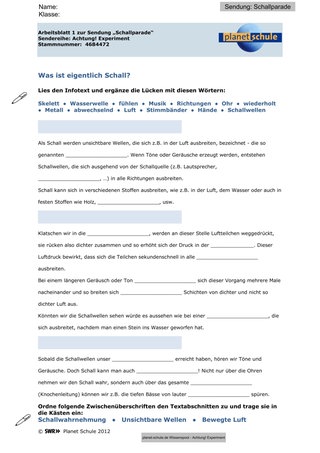 Der Film „Achtung! Experiment - Schallparade“ bietet zusammen mit den Arbeitsblättern eine anschauliche Möglichkeit das Naturphänomen „Schall“ genauer zu betrachten.