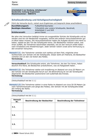 Noch bevor der Film gezeigt wird, sollen die Schüler/innen einen kleinen Selbstversuch zum Thema „Schallausbreitung und Schallgeschwindigkeit“ wagen. Hierzu dient das 2. Arbeitsblatt, auf welchem drei Versuche beschrieben sind, die sich mit nur wenigen Hilfsmitteln von der gesamten Klasse durchführen lassen. Wichtig ist, dass die Beobachtungen am Ende zusammengetragen und besprochen werden, denn was die Schüler/innen bei ihren Selbstversuchen festgestellt haben soll später auch mit dem im Film Gezeigten verglichen werden.