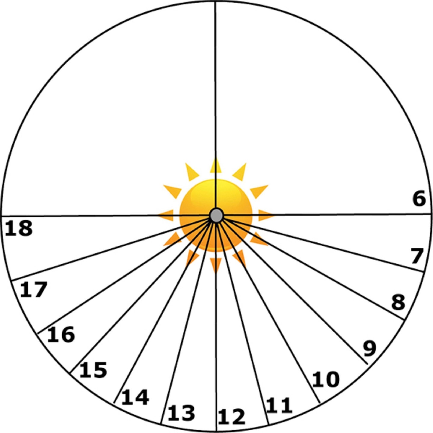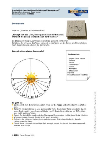 Für die Sonnenuhr (Arbeitsblatt 5) wird gebraucht: ein Bogen feste Pappe (das kann auch ein Stück aus einem Karton sein), eine Schere, ein Zirkel, ein Geodreieck, ein Lineal, einen Kompass, ein Stöckchen, Bleistift, Buntstifte oder Filzstifte.