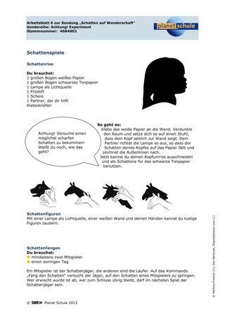 Für den Schattenriss (Arbeitsblatt 6) braucht man einen großen Bogen weißes Papier, einen großen Bogen schwarzes Papier (z.B. Fotokarton) eine Lampe als Lichtquelle, Klebestreifen.