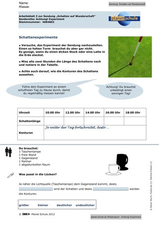 Die erste Aufgabe von Arbeitsblatt 3 kann nur als Hausaufgabe an einem Wochenende oder unterrichtsfreien Tag bearbeitet werden, denn es soll die Schattenlänge über einen Zeitraum von 10.00 Uhr bis 18.00 Uhr gemessen werden. In Ganztagsschulen könnte diese Aufgabe auf 16.00 Uhr begrenzt werden, um auch in der Schule erledigt werden zu können. Ideal wäre es, wenn die fertigen Arbeitsblätter in einer Mappe abgeheftet werden könnten, damit problemlos und schnell darauf zurückgegriffen werden kann.