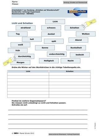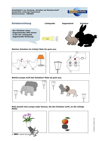Für die Durchführung des ersten Experiments auf Arbeitsblatt 3 brauchen die Kinder: einen dicken Stock oder eine Latte, für das zweite eine Taschenlampe, eine freie Wand, einen beliebigen Gegenstand und möglichst einen abgedunkelten Raum, damit der Schatten besser sichtbar wird.