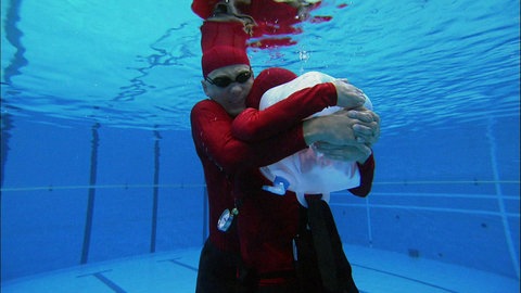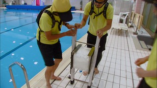 Eine Schatzkiste liegt am Grund eines Schwimmbeckens. Unsere Leute wollen sie bergen, doch nur ein mit Luft gefülltes Kissen steht ihnen zur Verfügung. Und das Kissen schwimmt bestens an der Wasseroberfläche. Wie könnte es gelingen, das Luftkissen so zum Beckengrund abtauchen zu lassen, dass es beim Wiederauftauchen die Schatzkiste nach oben holt? Kann die Auftriebskraft dabei helfen?
