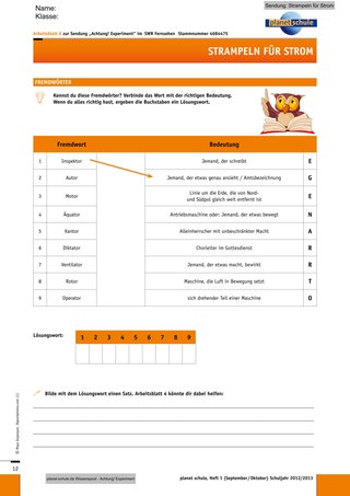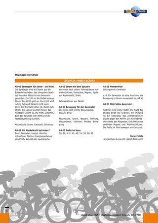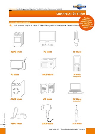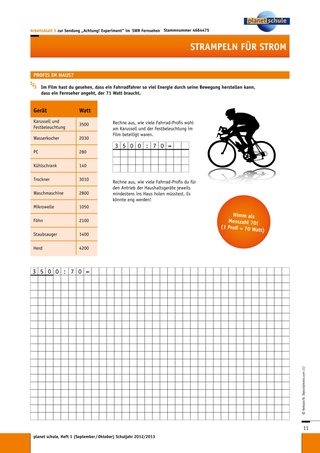 Auf Arbeitsblatt 5 wird berechnet, wie viele Profis man sich zum Betrieb verschiedener Geräte ins Haus holen müsste, wenn man zur Stromerzeugung Muskelkraft einsetzen wollte. Die Zahlen sind so gewählt, dass sie durch die angegebene Messzahl 70 ohne Rest teilbar sind. Als Steigerung der Schwierigkeit könnten individuell zusätzliche Aufgaben gewählt werden, bei denen ein Rest bleibt. Bei der abschließenden Diskussion über die Einsatzmöglichkeit der Muskelkraft zur Stromgewinnung können diese Zahlen verwendet werden. Einen Fernseher mit der eigenen Muskelkraft zu betreiben, ist zwar noch möglich und wäre sogar gesünder, als auf der Couch zu sitzen. Aber sich 60 Profis ins Haus zu holen, um einen Herd zu heizen, ist schier unmöglich, was jedem Kind Kraft der Zahlen deutlich wird.