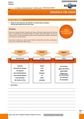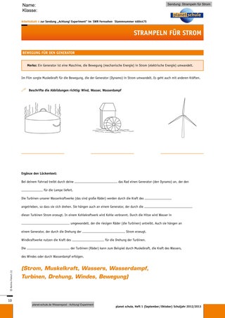 Ein Generator ist eine Maschine, die Bewegung (mechanische Energie) in Strom (elektrische Energie) umwandelt. Im Film haben die Kinder die Muskelkraft kennen gelernt, die die Bewegung schafft. Jetzt gehen wir einen Schritt weiter machen deutlich, dass Bewegung auch durch andere Kräfte (Wind, Wasser, Wasserdampf) entstehen kann.