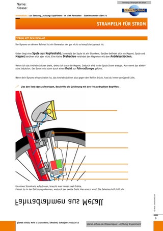 Anknüpfend an die eigene Erfahrung mit dem Dynamo als Generator sollten sie nun auch den relativ einfachen Aufbau eines solchen Stromerzeugers und seine Funktion kennen lernen. Sie benennen die einzelnen Teile, beziehungsweise beschriften eine Zeichnung entsprechend (Arbeitsblatt 3).