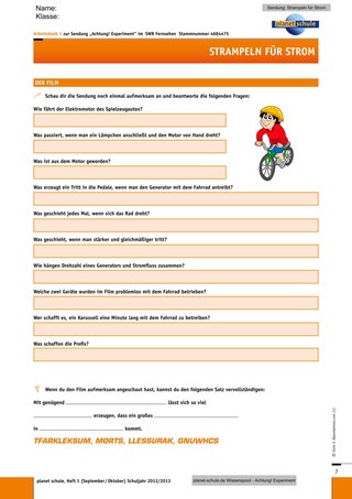 Strom mit der eigenen Muskelkraft selbst herzustellen, wäre eine günstige Alternative zum Strom aus der Steckdose. Nachdem sie sich noch einmal eingehend mit dem Inhalt des Films befasst haben (Arbeitsblatt 1) überlegen die Kinder, welche Geräte mit einem einzigen Fahrrad angetrieben werden könnten.