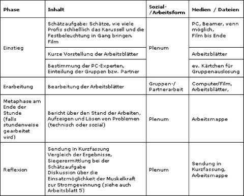 Der Film eignet sich als Einstieg in die Beschäftigung mit dem Thema Energie. Er zeigt, wie ein Generator Bewegung in Strom umwandelt. Die Kinder kennen diese Art der Energiegewinnung durch ihr eigenes Fahrrad, dessen Dynamo der Generator ist, der ihre eigene Bewegung zu Strom für die Lampe werden lässt. Er zeigt für die Kinder sehr einleuchtend, dass man zwar mit Muskelkraft Strom selbst herstellen kann, dass das aber sehr anstrengend und als Einzelleistung kaum zu schaffen ist. Die Dimensionen, die das Experiment annimmt, machen die Fakten einprägsam.