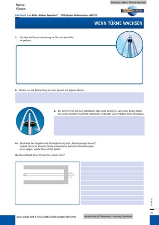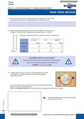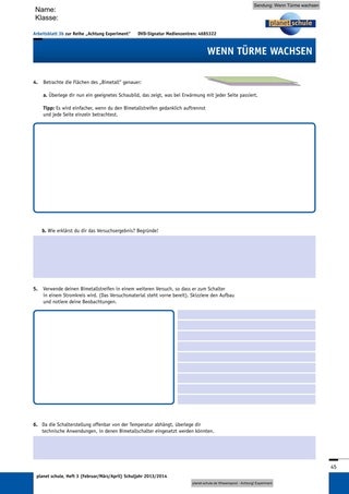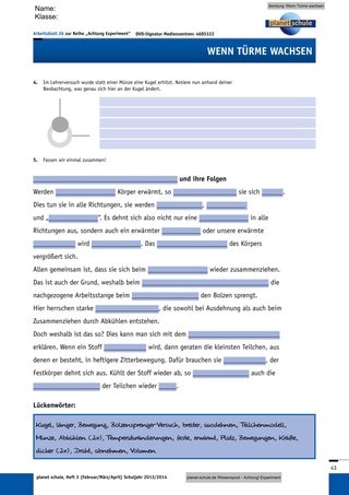 Das Arbeiten mit Versuchen zum Erfassen von Phänomenen hat sich bewährt. Die Schüler arbeiten damit gerne und sind motiviert. Die Transferfragen sollen den Alltagsbezug herstellen. „Wenn Türme wachsen“ mit diesen Materialien zu bearbeiten und zu besprechen, wird zwischen vier und sechs Stunden umfassen, je nach Ausgangssituation in der Lerngruppe.