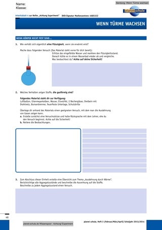 - Um der Teileinheit „Ausdehnung durch Temperaturerhöhung“ gerecht zu werden, werden im Anschluss zwei weitere Versuche durchgeführt, um das Verhalten flüssiger und gasförmiger Stoffe gleichfalls zu testen.
