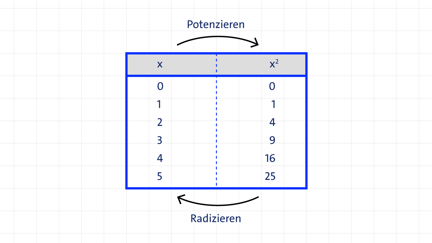 Das Wurzelziehen bzw. Radizieren (lat. Radix = Wurzel) ist die Umkehrung des Potenzierens. Beim Wurzelziehen wird derjenige Wurzelwert gesucht, der mit sich selbst multipliziert den Wert unter der Wurzel ergibt.