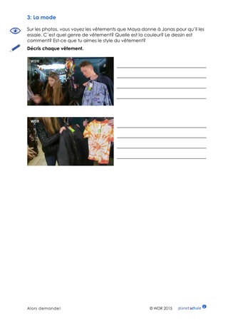 Die Verkäuferin Maya reicht Jonas verschiedene Kleidungsstücke zum Anprobieren. Was sind das für Kleidungsstücke? Die Schüler beschreiben sie. (Filmclip 6: "La mode" (Timecode: 06:07 - 08:14 Min.))