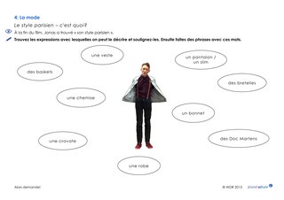 Was ist der "Pariser Stil"? Die Schüler streichen die richtigen Begriffe an und bilden aus ihnen Sätze, die sie entweder auf dem Arbeitsblatt oder im Heft notieren. (Filmclip 6: "La mode" (Timecode: 09:08 - 09:16 Min.))
