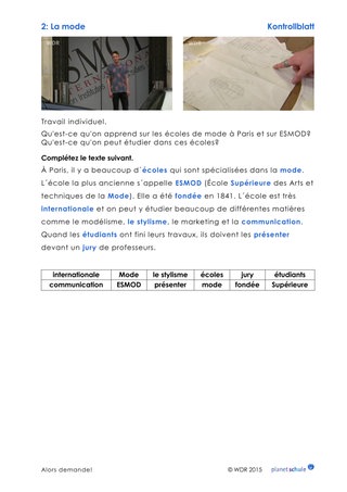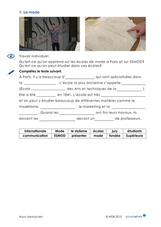 Was erfährt man über die im Film vorgestellten Modeschulen? Die Schüler füllen dazu einen Lückentext aus. (Filmclip 6: "La mode" (Timecode: 01:37 - 03:39 Min.))