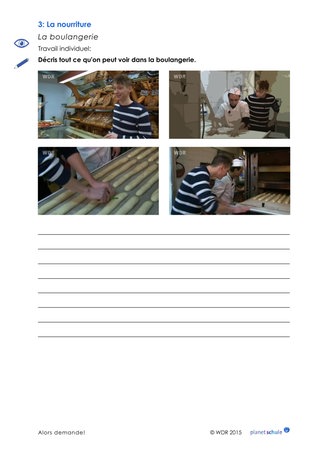 Beschreibe alles, was man in der Bäckerei sehen kann. Die Screenshots dienen als Erinnerungsgrundlage. Alternativ kann die Szene auch mehrfach gezeigt werden. (Filmclip 3: "La nourriture" (Timecode: 01:42 - 03:16 Min.; 08:31 - 08:47 Min.))
