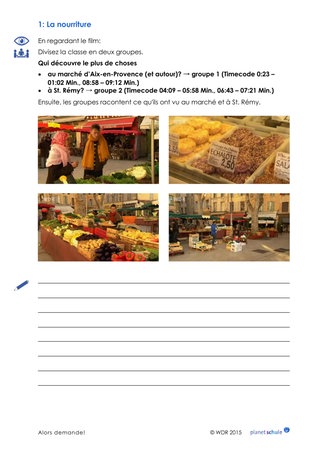 Die Klasse wird in zwei Gruppen geteilt. Gruppe 1: Wer entdeckt die meisten Dinge auf dem Markt in Aix-en-Provence (und um den Markt herum)? Gruppe 2: Wer entdeckt die meisten Dinge in St. Rémy und auf dem Weg dorthin? Anschließend erzählen sich die Gruppen gegenseitig, was sie auf dem Markt und in den Straßen entdeckt haben. Filmclip 2: "La nourriture" (Timecode Gruppe 1: 0:23 - 01:02 Min.; 08:58 - 09:12 Min.; Timecode Gruppe 2: 04:09 - 05:58 Min.; 06:43 - 07:21 Min.)